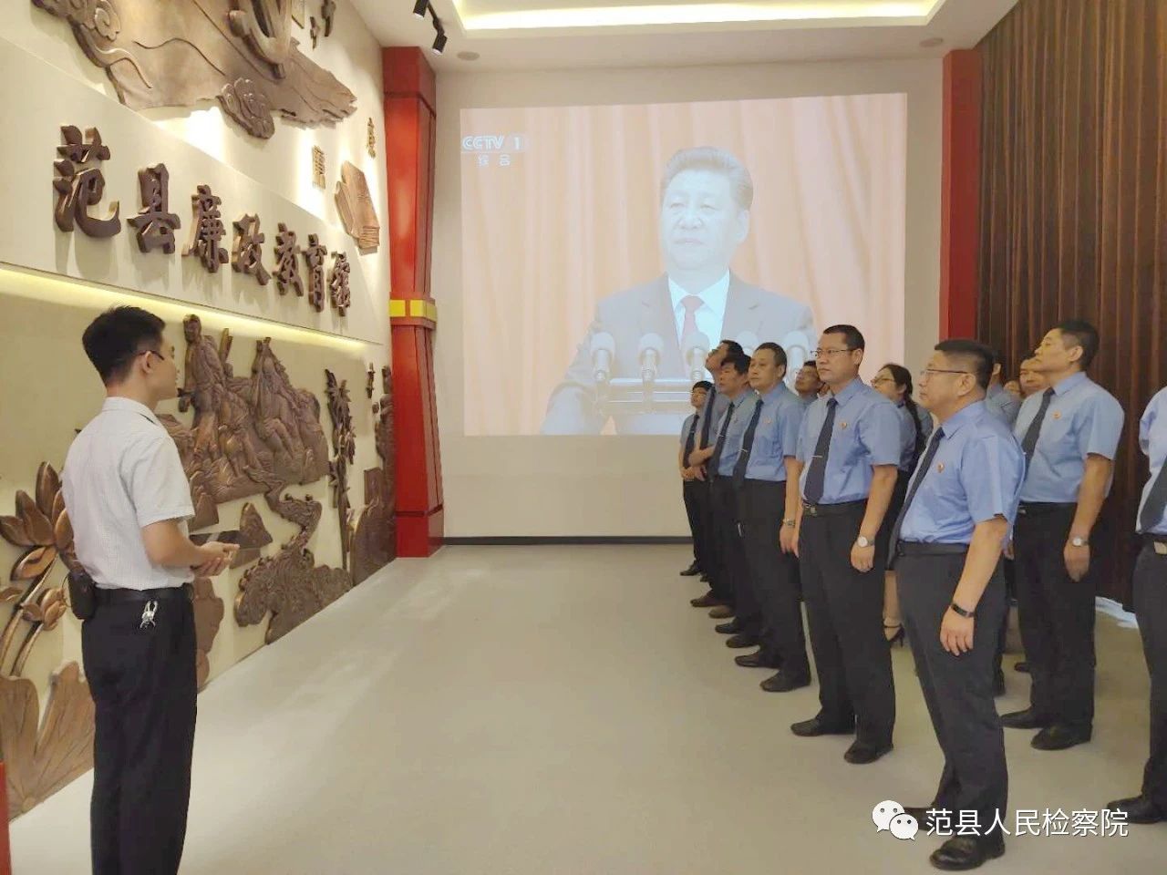 廉政教育基地根据范县特点设立了3个展厅,分别是纪律篇红色传承砥砺初心,警示篇以案警示检视初心,实践篇从严治党永葆初心。范县检察院干警跟随讲解员的专业解说,系统的回顾了中国共产党的历史及反腐历程,集中观看了习近平总书记关于不忘初心牢记使命专题讲话和十八大以来党风廉政建设和反腐败斗争取得的成果,特别是我县涉及违纪违法的鲜活案例及工作成效。最后,大家重温入党誓词,深刻铭记中国共产党赋予的新时代使命。一系列震人心魄的真实案例及一批批感人至深的共产党员事迹,使干警接受了一场深刻的精神洗礼。