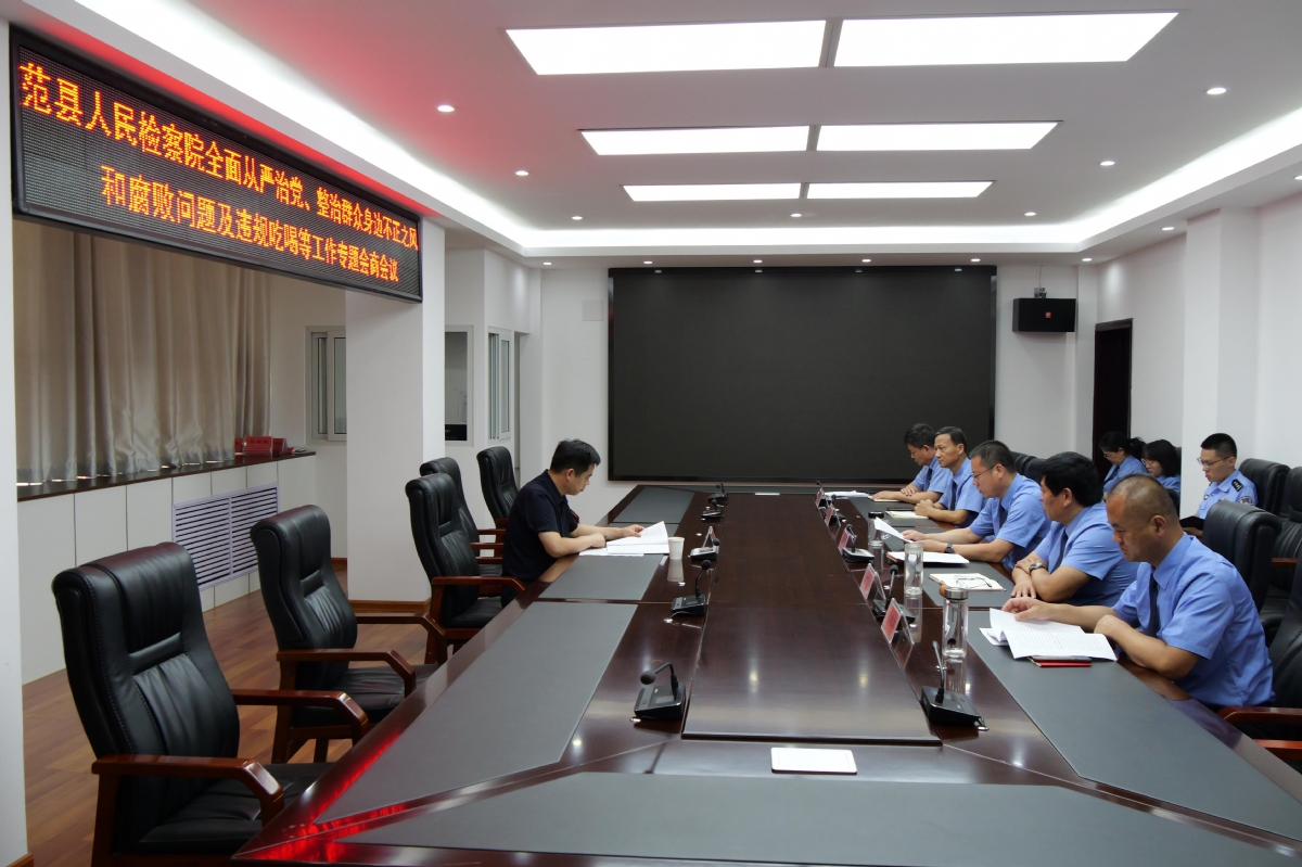 6月28日,范县人民检察院围绕落实全面从严治党主体责任、群众身边不正之风和腐败问题集中整治、违规吃喝专项整治等工作召开专题会商会议。党组书记、检察长于爱江主持会议,县纪委监委第二纪检监察室主任袁道臣到会指导,范县检察院党组成员、相关部门负责人参加会议。