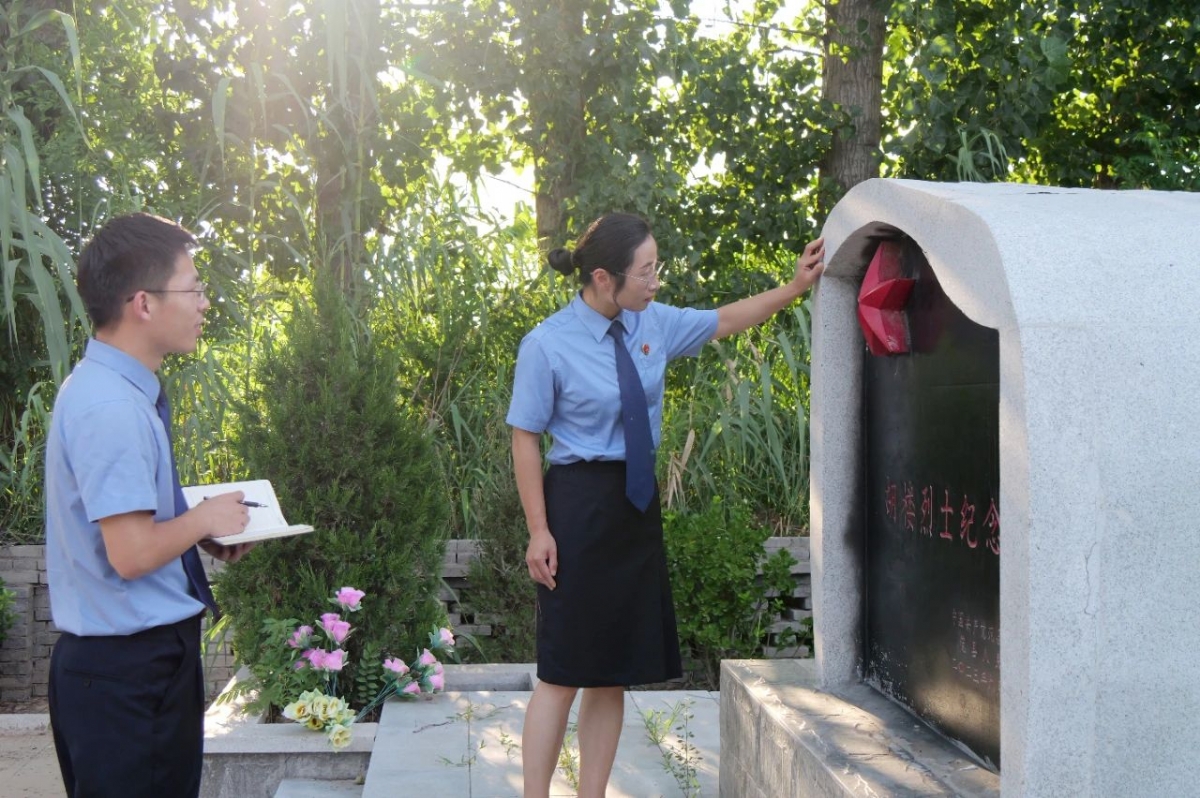 孟秋时节,暑气未消。8月20日,河南省范县龙王庄镇胡楼烈士墓群纪念碑前,范县人民检察院公益诉讼部门干警正在开展英烈纪念设施保护公益诉讼“回头看”专项行动,实地查看英雄烈士纪念设施的修缮、管理情况。