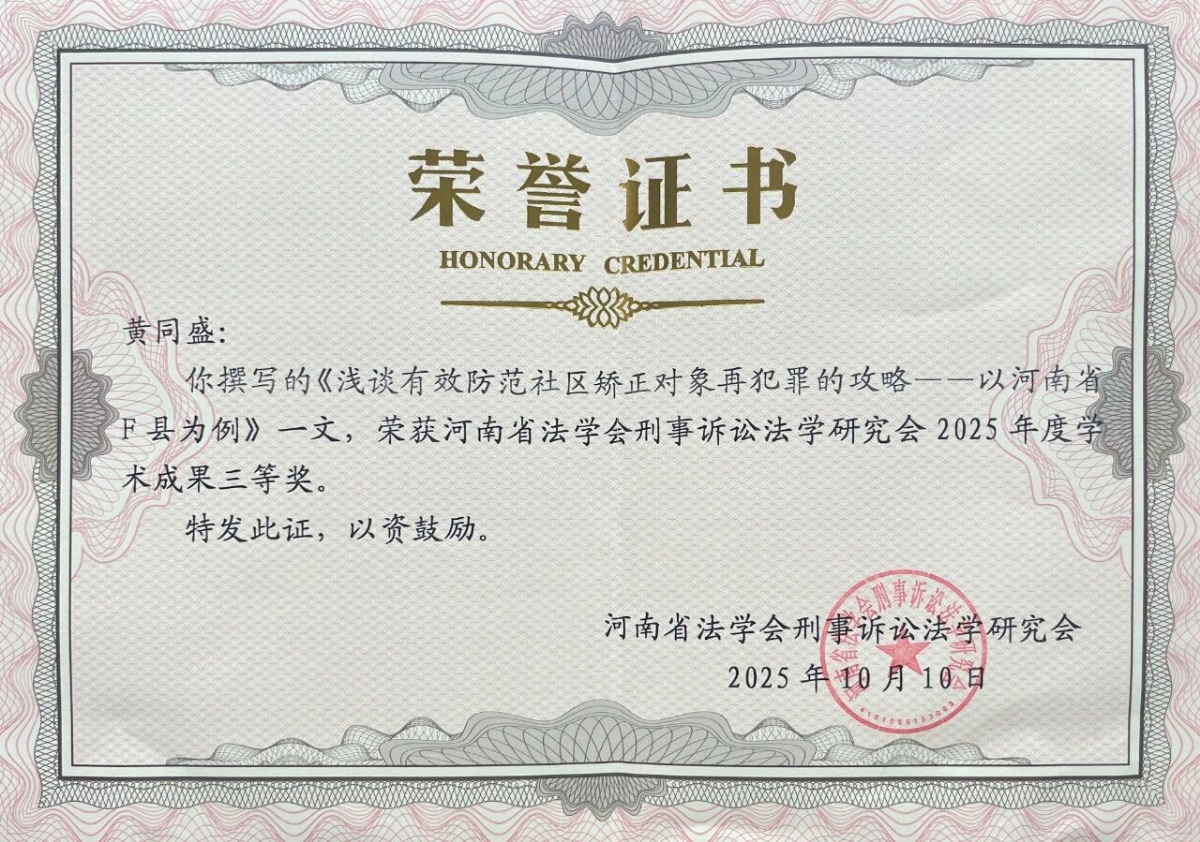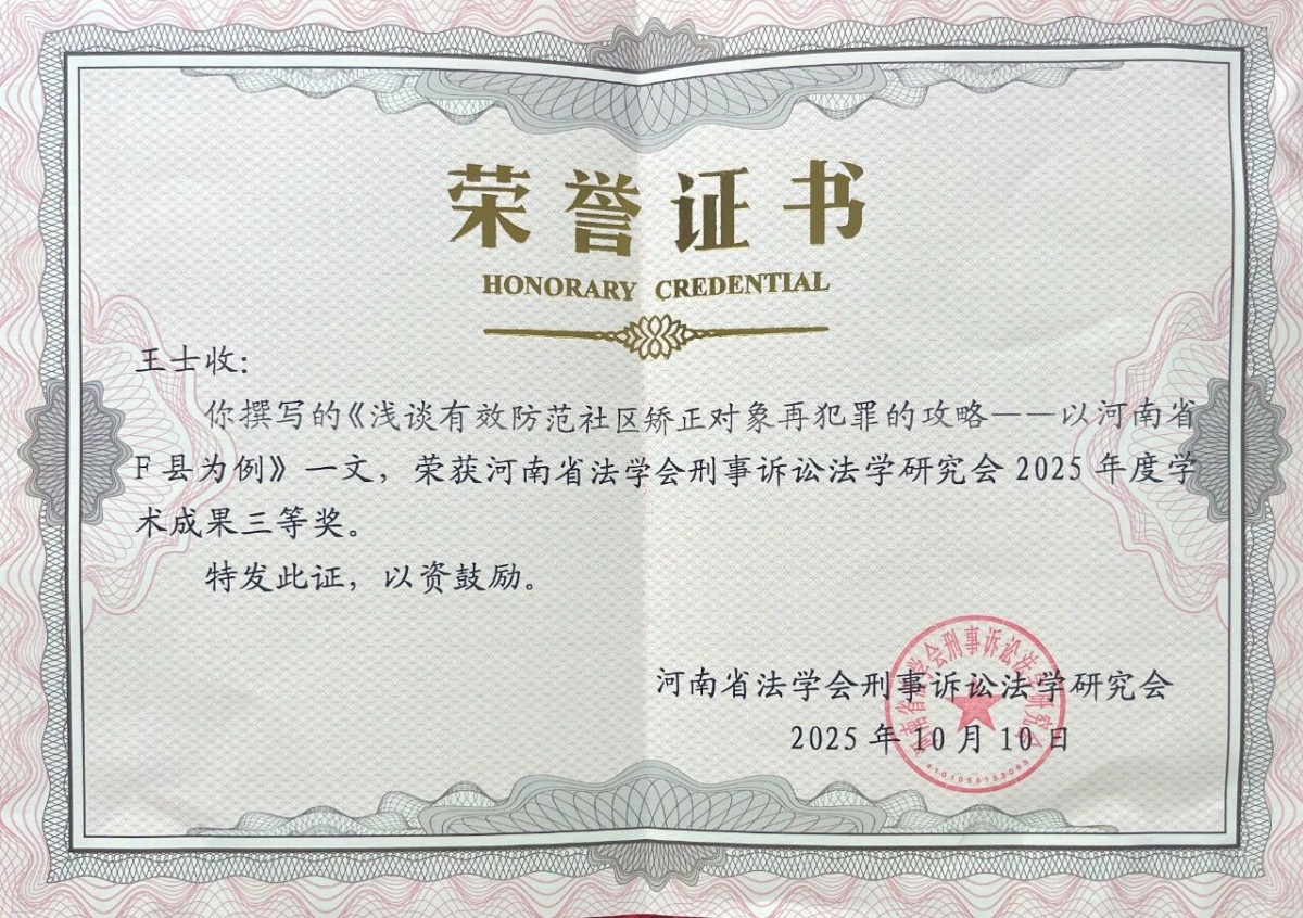 近日,我院刑事执行检察组黄同盛、王士收撰写的《浅谈有效防范社区矫正对象再犯罪的攻略——以河南省F县为例》一文,荣获河南省法学会刑事诉讼法学研究会2025年度学术成果三等奖。