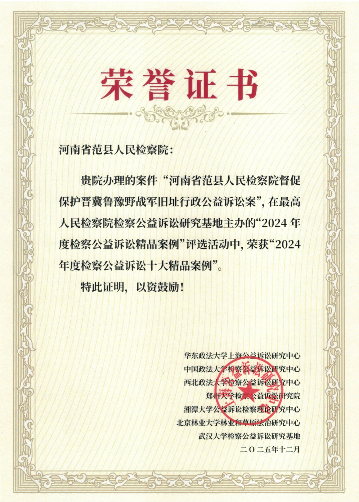 近日,由最高人民检察院七大检察公益诉讼研究基地共同举办的“2024年度检察公益诉讼精品案例”评选结果正式对外公布,由范县人民检察院办理的督促保护晋冀鲁豫野战军指挥部旧址行政公益诉讼案入选,荣获“2024年度检察公益诉讼十大精品案例”。